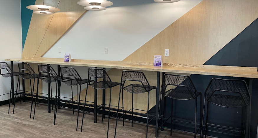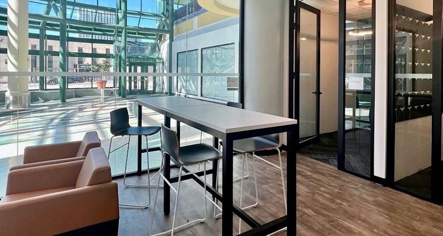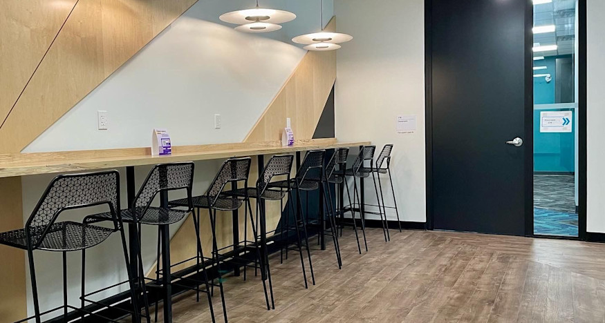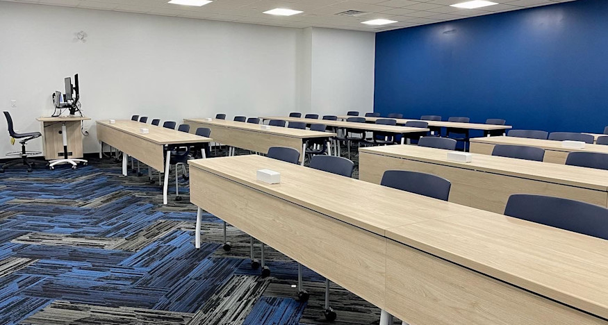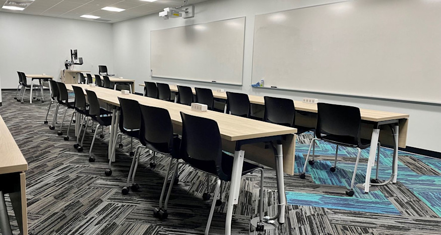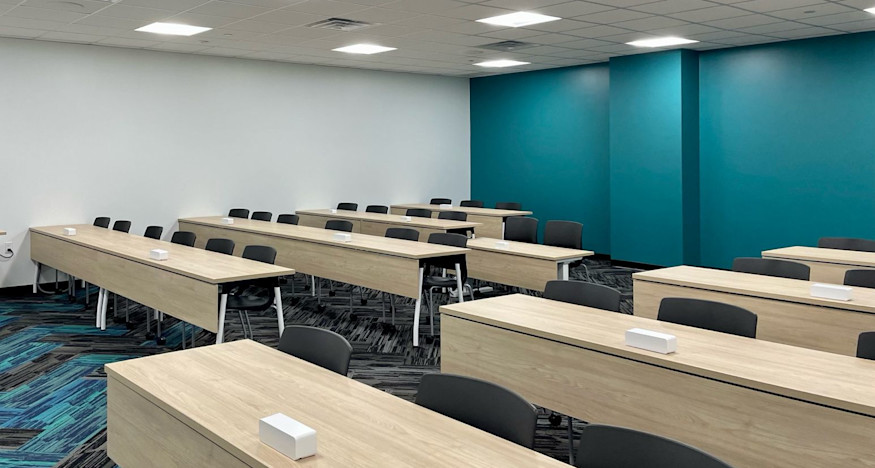 The recently transformed space matches the vibrant, tech-forward design found throughout the campus, including new flooring, paint, LED lighting, millwork, AV/IT equipment connectivity, and upgraded sprinkler systems.