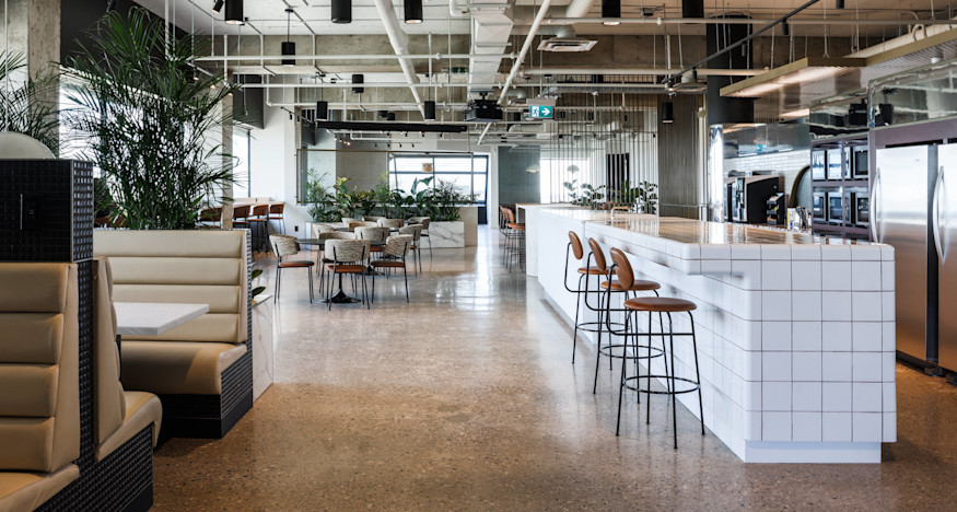 The office common areas include an open dining area with a breakfast bar and diner-style booths, various lounges for relaxation, private rooms for personal phone calls and glass-encased areas with open seating and greenery in each of the four corners.